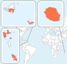 Map of Guadeloupe, Martinique, Saint Barthélemy, Saint Martin (French part), Réunion